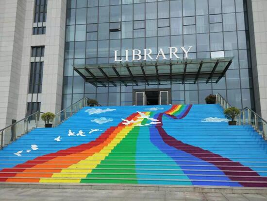 参与此次绘制活动的张伟娜同学介绍说:“这么大的幅面,我们画了两天,先用丙烯颜料画,耐得住风吹日晒,然后再喷层清漆,防止大雨冲洗。因为是画在台阶的侧面,所以从台阶下仰视,就呈现出了立体效果。”路过的同学,无不被这震撼的立体视图特效深深吸引,“工科大学也越来越生动了!”、“通向知识殿堂的图书馆楼梯,被彩绘得这么好看,这下更有学习的动力了。”巨幅的彩绘,引得不少同学驻足拍照。