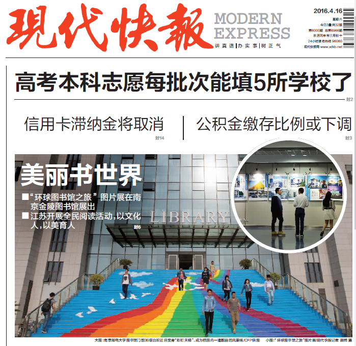 【现代快报】南京邮电大学图书馆门前的台阶近日变身“彩虹天梯”(封面图)