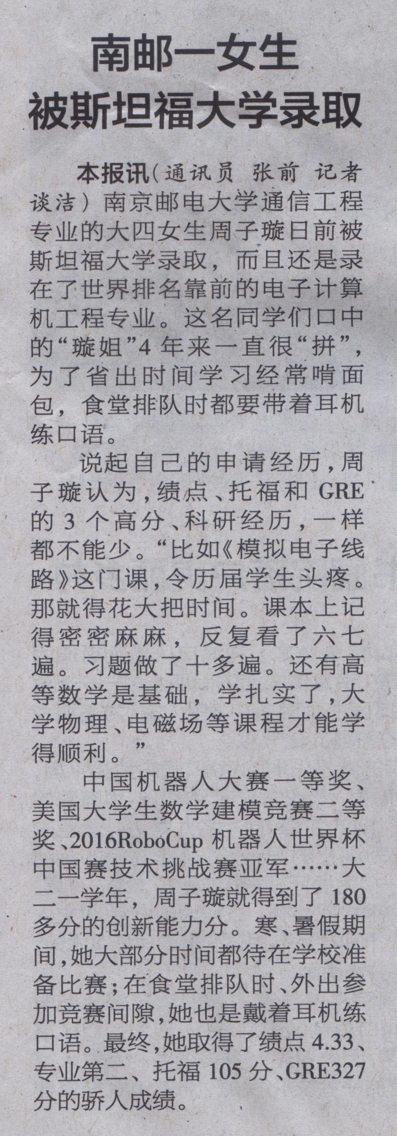 【南京日报】南邮一女生被斯坦福大学录取