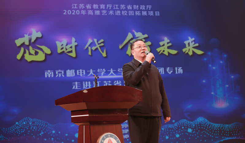 海门中学石鑫书记致欢迎辞,他真挚感谢我校高雅艺术进校园活动在海门中学进行专场演出。他指出,“芯时代 信未来”专场演出是一场将技术、道德和美学三者有机结合的艺术盛宴,是人的多元智能的充分体现和信息时代人的丰富情感的高雅表达,对于丰富校园文化生活,提升校园文化品位,发挥了重要的积极作用。他强调,这是南邮与海门中学深厚友谊的情感,也是南邮人与海中人在对真、善、美追求中所表现的一致性、共通性的美好情感。
