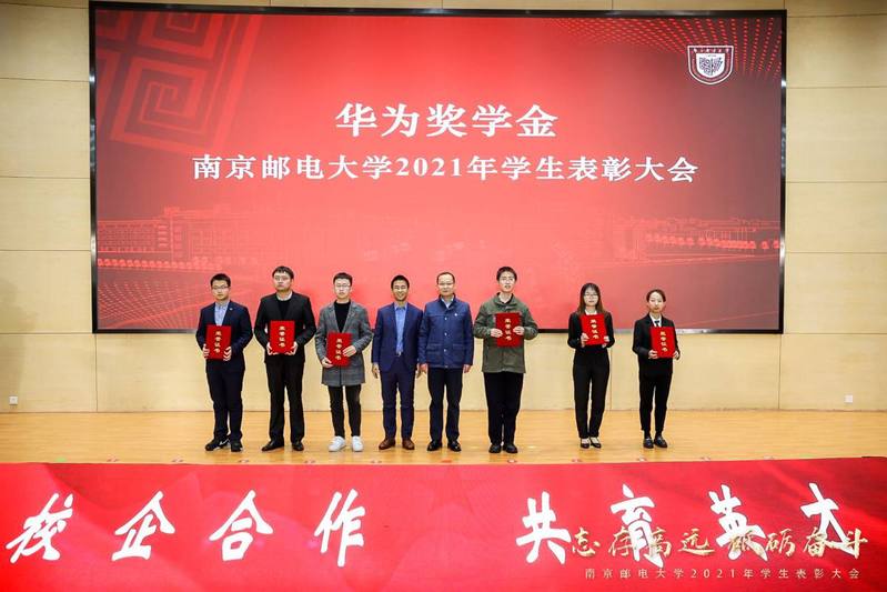荆晅副校长和胡皓部长为“华为奖学金”获奖学生代表颁奖