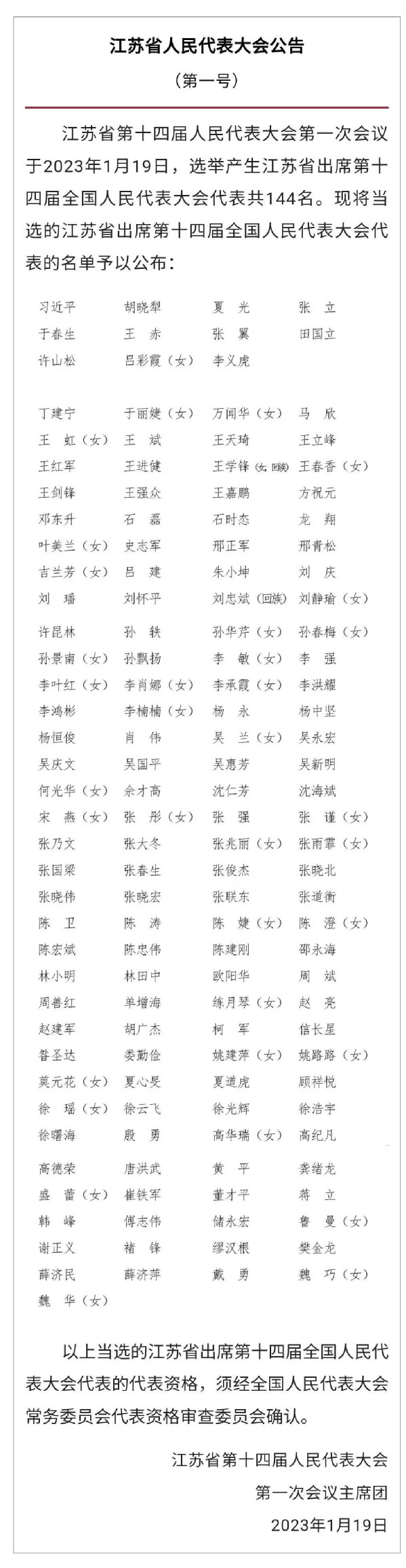 据悉,当选的江苏省出席第十四届全国人民代表大会代表的代表资格,须经全国人民代表大会常务委员会代表资格审查委员会确认。
