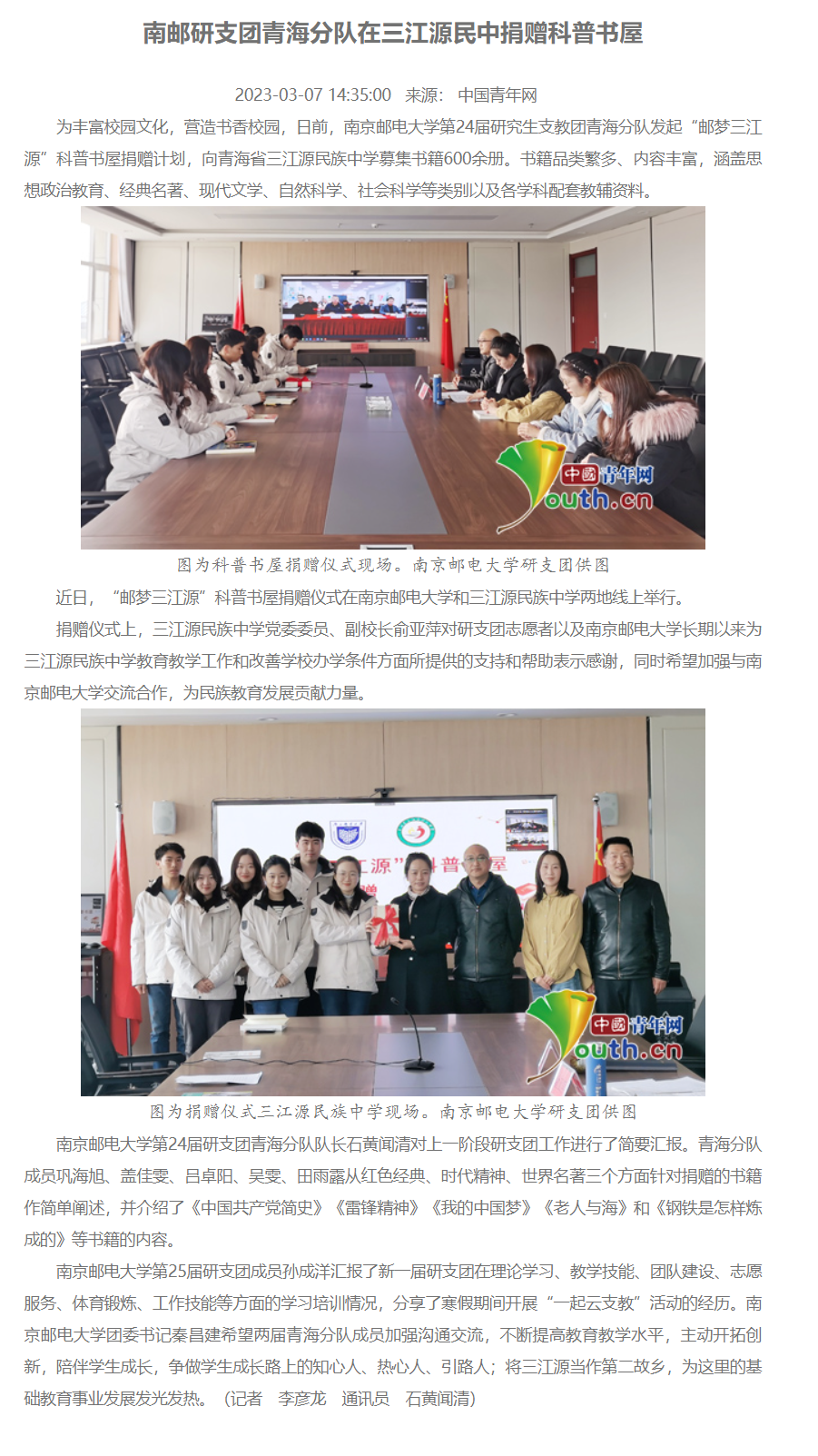 【中国青年网】南邮研支团青海分队在三江源民中捐赠科普书屋