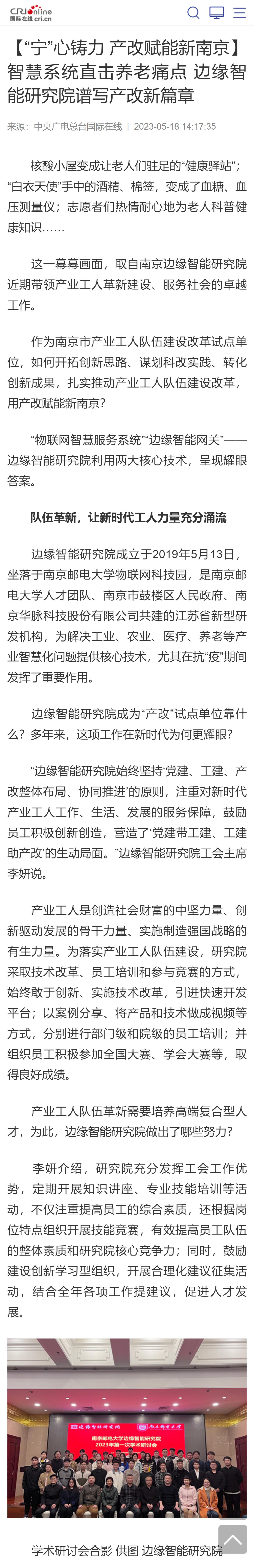 【中央广电总台国际在线】智慧系统直击养老痛点 边缘智能研究院谱写产改新篇章
