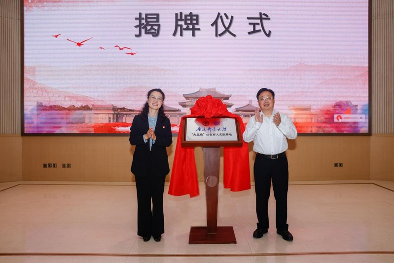 签约仪式后,校党委书记刘陈与雨花台烈士陵园管理局副局长黄莹共同为实践基地揭牌。
