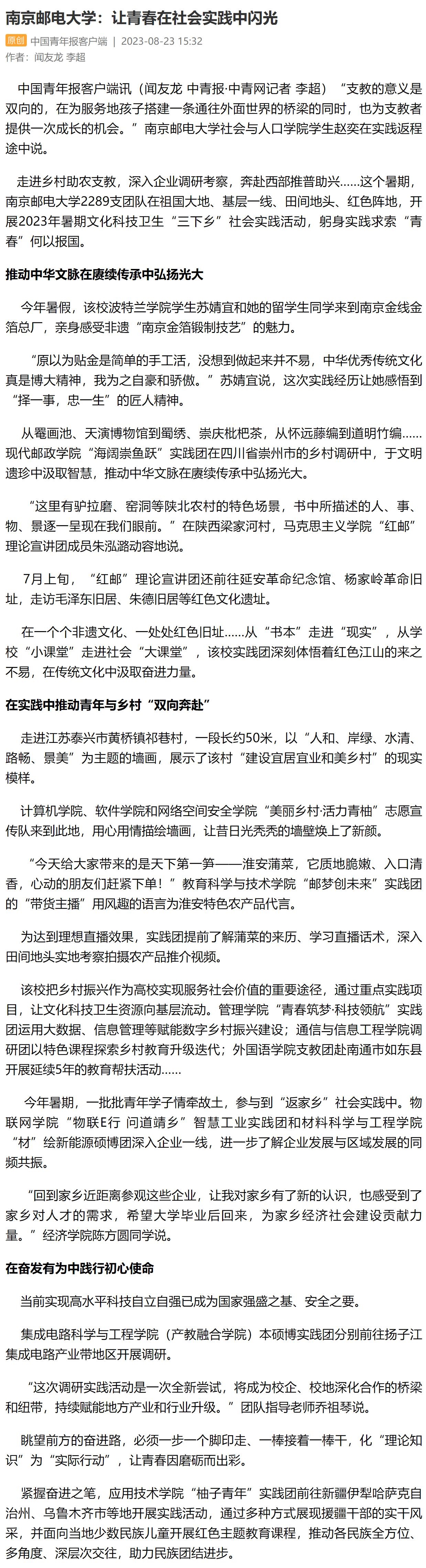 【中国青年报客户端】南京邮电大学:让青春在社会实践中闪光