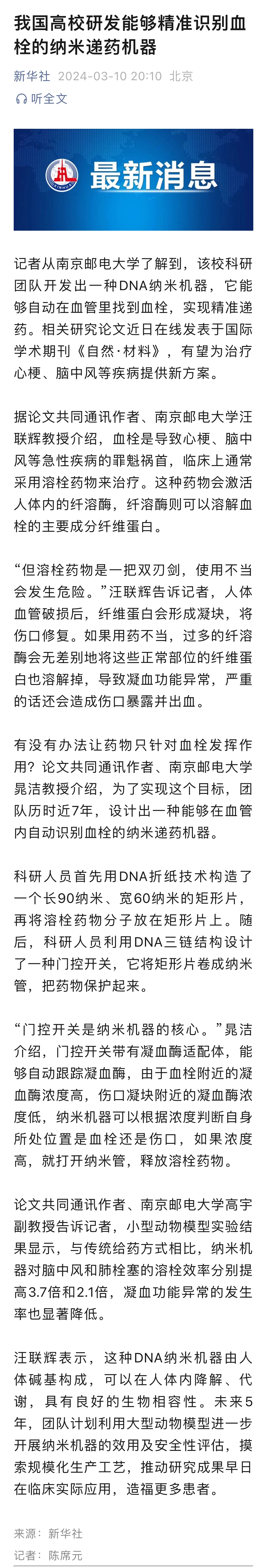 【新华社微信公众号】我国高校研发能够精准识别血栓的纳米递药机器