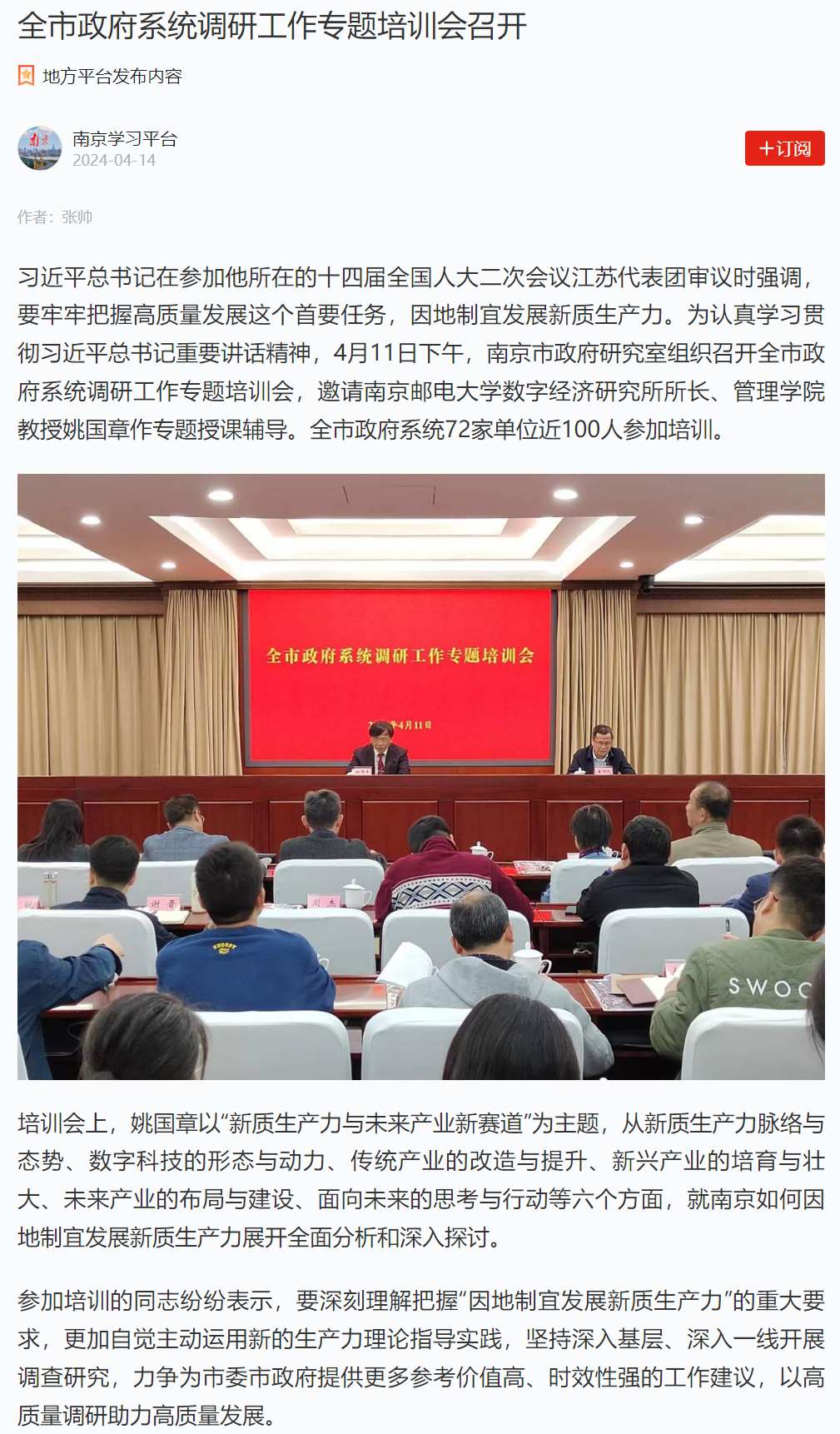 【学习强国】南邮管理学院教授姚国章作全市政府系统调研工作专题授课辅导