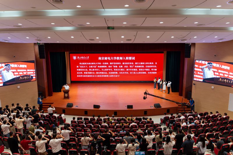 为将我校教师的良好精神风貌和教学科研本领代代相传,大会组织老教职工代表为新入职教职工代表佩戴校徽并赠送书籍,全体新入职教职工进行入职宣誓。