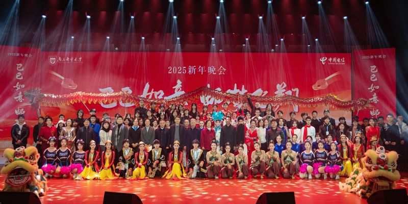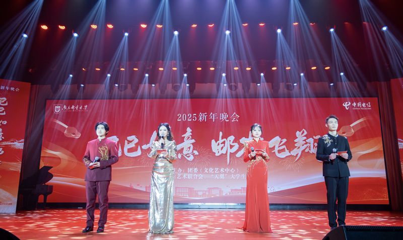 12月18日晚,南京邮电大学2025年“巳巳如意邮梦飞翔”主题新年晚会在仙林校区安恒青春剧场举行。校党委书记郭宇锋,党委副书记蒋国平,党委常委、副校长姜小舜,省纪委监委派驻我校纪检监察组组长、党委常委、纪委书记、二级高级监察官周和林,党委常委、副校长谢平,中国电信南京分公司党委委员、副总经理、我校94级校友杨春泽,中国电信南京分公司校园营销服务中心副总经理杨茜,部分校友代表、学校相关职能部门负责人、分管学生工作副书记和师生代表欢聚一堂,共享美好时光。
