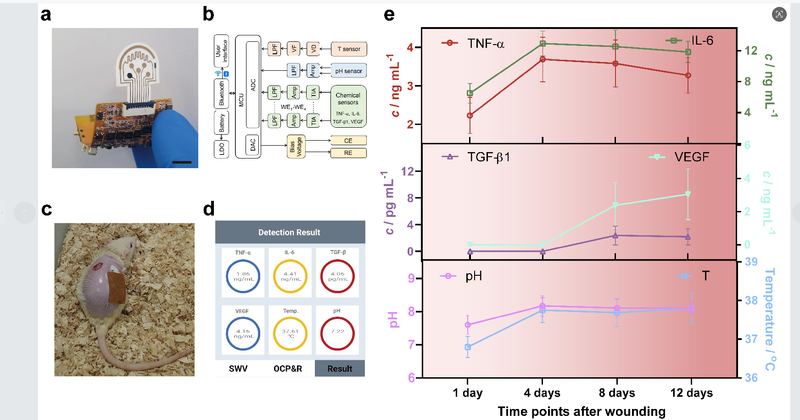 结合无线通讯模块,该平台可同时监测多种伤口愈合相关蛋白质(TNF-α、IL-6、TGF-β1和VEGF)以及pH值、温度等关键生理参数(图2a-c)。该无线传感平台可在不会妨碍愈合情况下实现对糖尿病小鼠未感染伤口和感染伤口准确、原位监测(图2d, e)。相较于传统伤口监测手段,该柔性传感系统提高了灵敏度和稳定性,同时能够实时、多参数检测,未来有望基于分子特征指导治疗决策,并与智能敷料集成实现响应式治疗。
