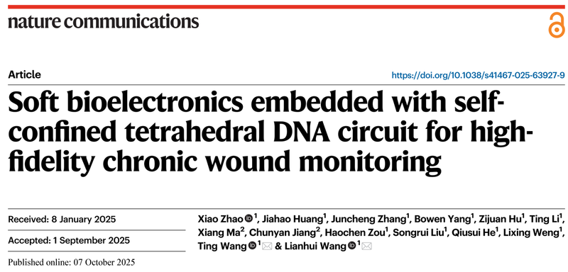 近日,南京邮电大学柔性电子全国重点实验室、化学与生命科学学院汪联辉教授和王婷教授团队在柔性电化学传感领域取得重要进展。该团队开发出一种新型柔性生物电子传感系统可实现伤口原位、实时、高保真和多模态监测。10月7日,相关研究成果以“Soft bioelectronics embedded with self-confined tetrahedral DNA circuit for high-fidelity chronic wound monitoring”为题,发表在国际学术期刊Nature Communications上。博士后赵晓为论文第一作者,汪联辉教授和王婷教授为论文的共同通讯作者。