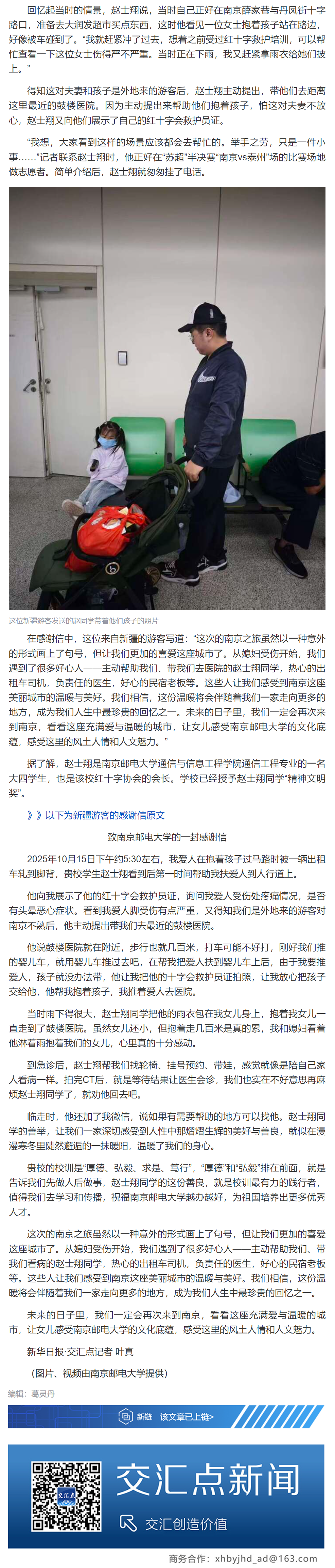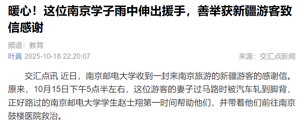 【新华日报客户端】暖心!这位南京学子雨中伸出援手,善举获新疆游客致信感谢