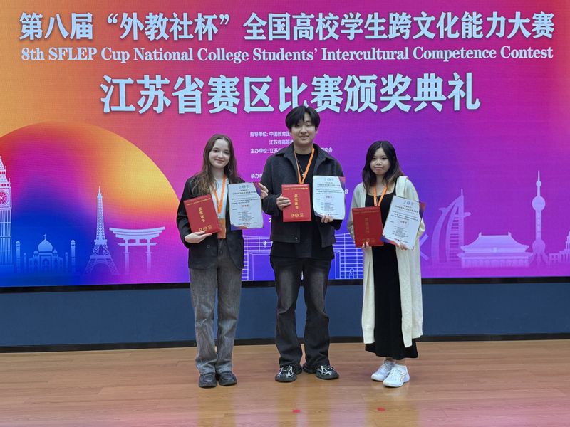 10月24—26日,第八届“外教社杯”全国高校学生跨文化能力大赛江苏省赛区比赛在徐州举行。南京邮电大学留学生Iudina Ekaterina(俄罗斯籍)、Kim Hojung(韩国籍)和Bong Alicia(印度尼西亚籍)组成的参赛队伍以第一名成绩获国际学生组特等奖,并将参加全国总决赛。这是南邮留学生团队第四次以江苏省国际学生组第一名成绩晋级国赛。