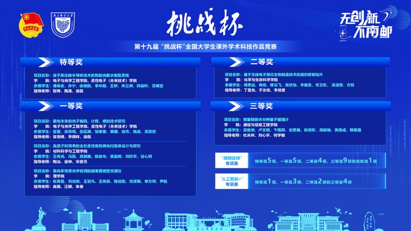 11月3日,第十九届“挑战杯”全国大学生课外学术科技作品竞赛终审决赛在南京闭幕,南京邮电大学获主体赛特等奖1项、一等奖3项、二等奖1项和三等奖1项;“揭榜挂帅”专项赛特等奖5项、一等奖5项、二等奖4项、三等奖9项和优胜奖1项;“人工智能+”专项赛特等奖1项、一等奖3项、二等奖2项和三等奖4项。南邮首次实现特等奖赛道全覆盖,竞赛总积分达到历史最好成绩,全国并列第十五、江苏并列第二、省属高校第一,再捧国赛“优胜杯”。