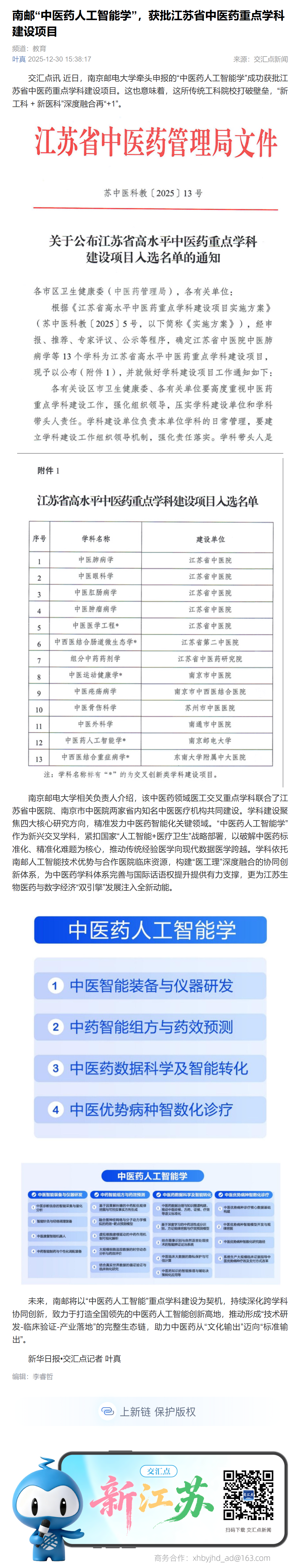 【新华日报客户端】南邮“中医药人工智能学”,获批江苏省中医药重点学科建设项目