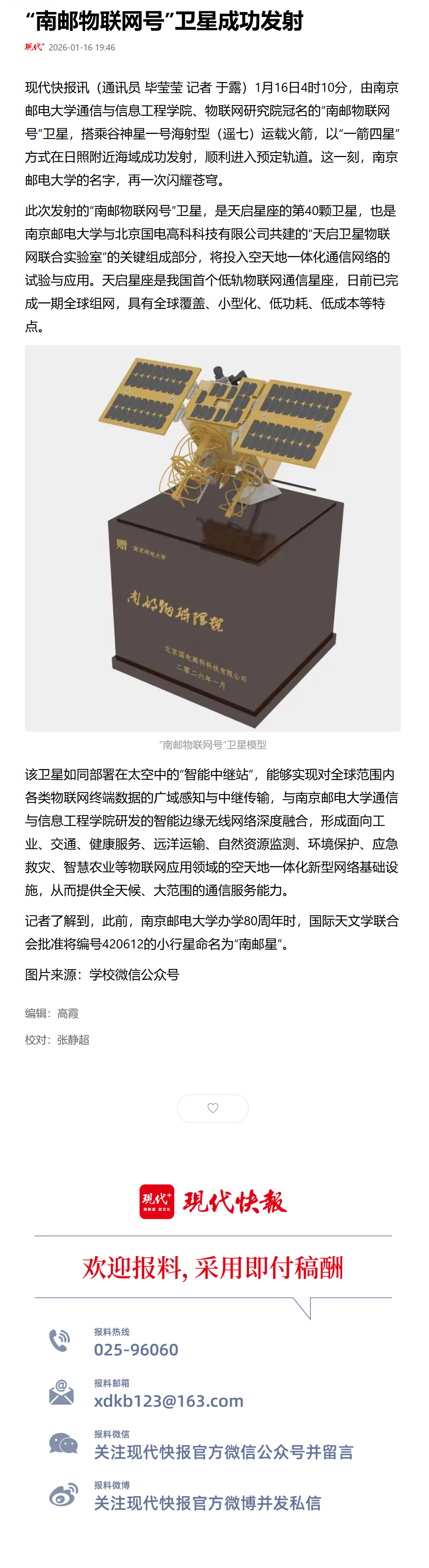【现代快报全媒体】“南邮物联网号”卫星成功发射