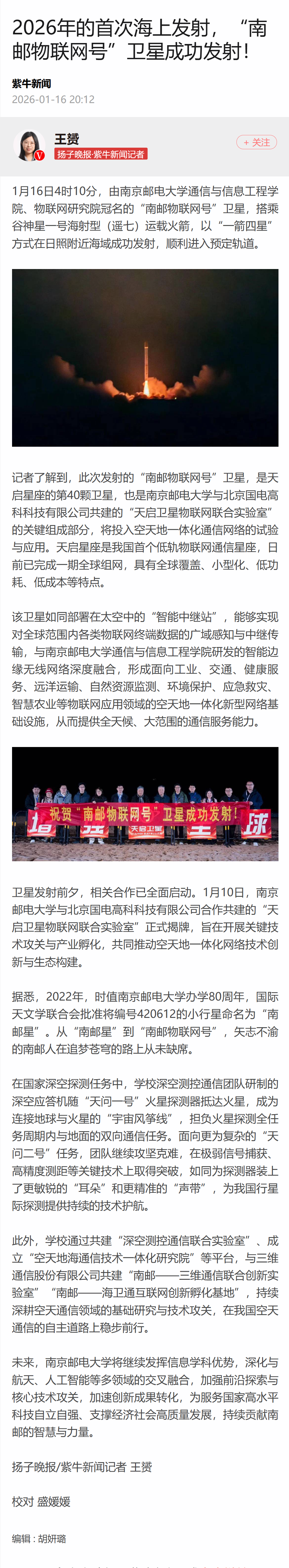 【扬子晚报客户端】2026年的首次海上发射,“南邮物联网号”卫星成功发射!