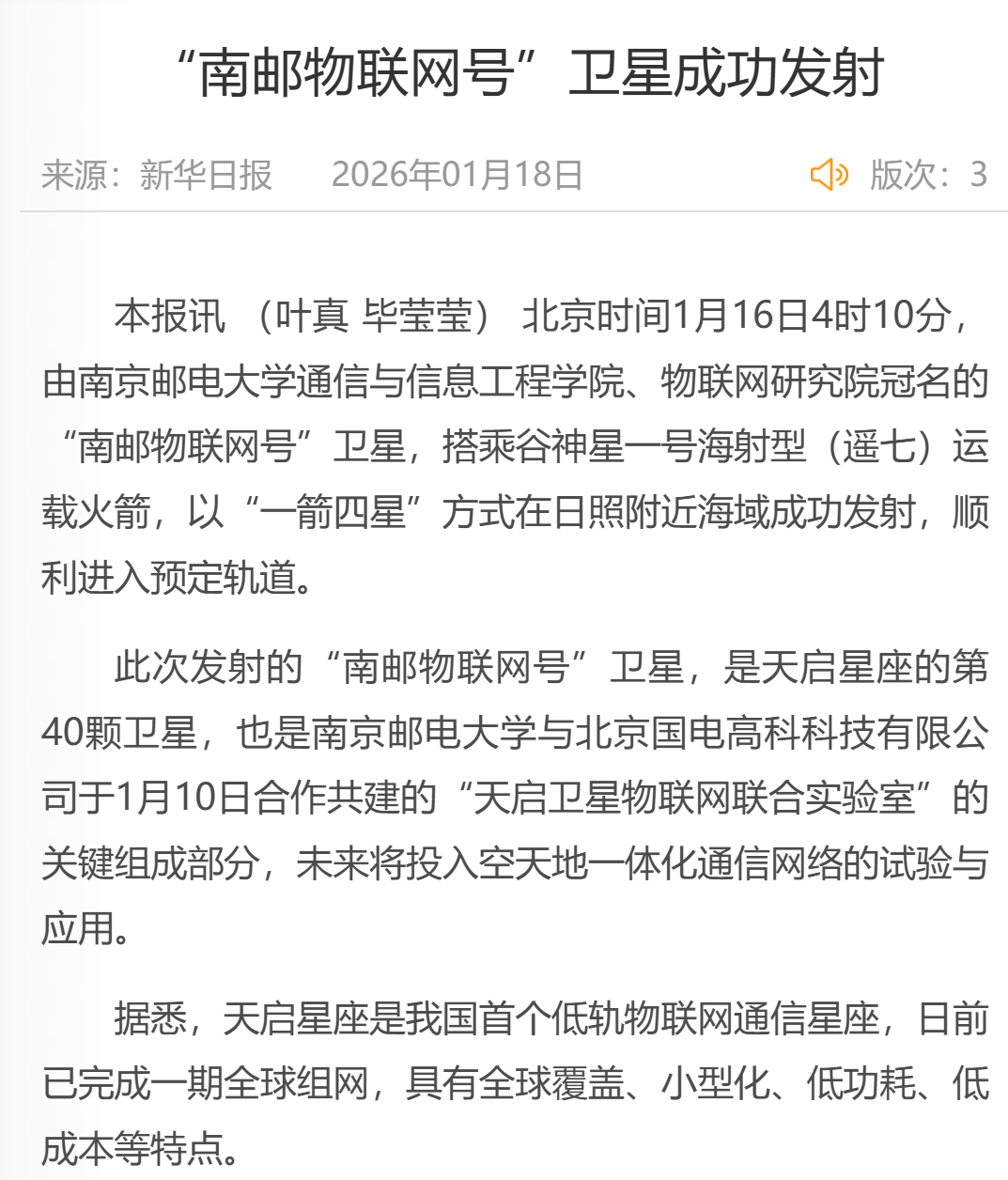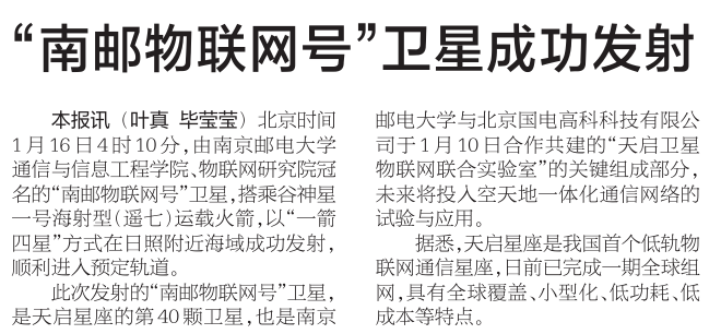 【新华日报】“南邮物联网号”卫星成功发射