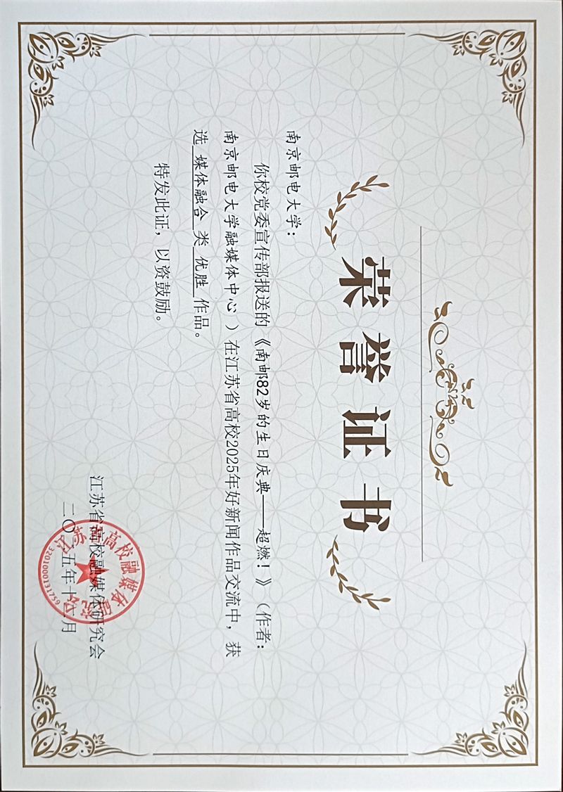 近日,江苏省高校融媒体研究会2025年年会在南京举行。大会对入选“江苏省好新闻奖”的高校优秀作品进行了表彰,并举行了江苏高校年度好新闻作品及融媒体创新案例推介交流与展示。南邮获1项融媒体创新“十佳”案例、5项好新闻作品类奖项。其中,《云矩阵 青声量 协作链——全国高校联祭创新实践》入选2025年度融媒体创新“十佳”案例,《南邮82岁的生日庆典——超燃!》获媒体融合类优胜作品,《九一八,铭记历史,勿忘国耻》获纪录片类优胜作品,《用一流课程培养新“邮”人》《南邮在世界顶尖赛事中取得突破性成绩!》获文字作品类优秀作品,《2024年05月01日第338期第03版:校庆专版》获版面类优秀作品。
