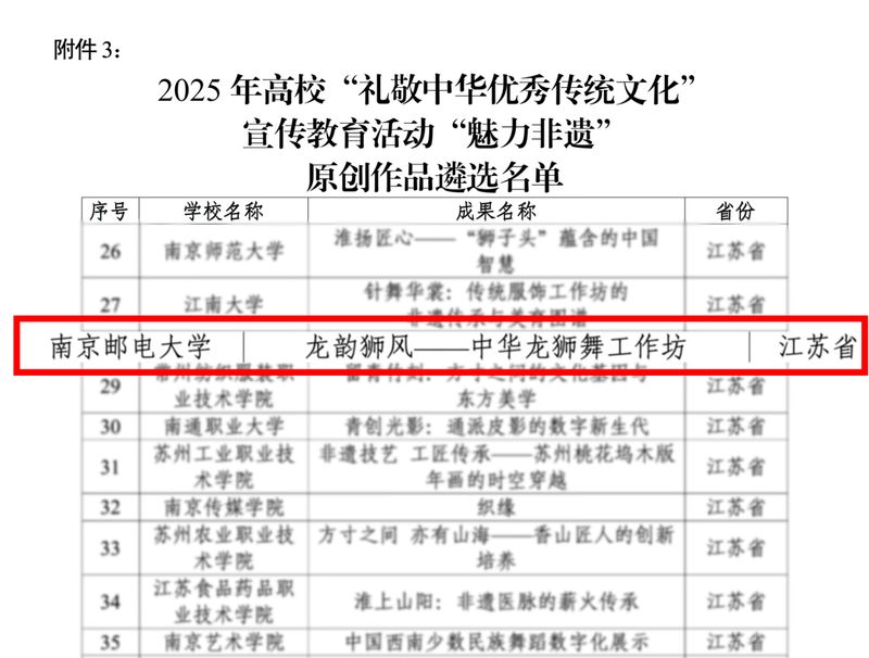 近日,教育部公布2025年高校“礼敬中华优秀传统文化”宣传教育活动评选结果,南京邮电大学《龙韵狮风——中华龙狮舞工作坊》项目入选“魅力非遗”原创优秀作品名单。