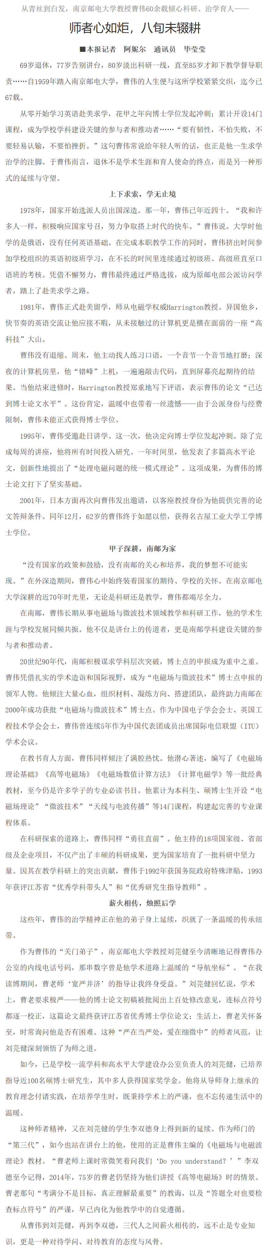 【江苏教育报】师者心如炬,八旬未辍耕——从青丝到白发,南京邮电大学教授曹伟60余载倾心科研、治学育人