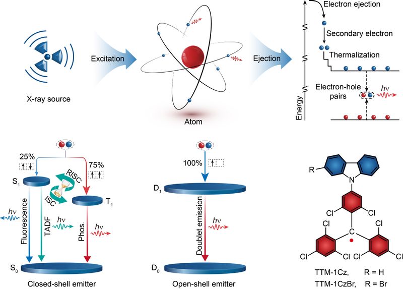 有机X射线闪烁体材料具有结构易修饰、可柔性、成本低、毒性小等优点,在X射线成像、辐射检测和光动力治疗等领域有广泛的应用前景,近年来一直是材料化学界的研究热点。但现存的有机X射线闪烁体材料都为闭壳分子,其在X射线辐射下会产生25%可以辐射发光的单线态激子和75%难以辐射发光的三线态激子,存在激子利用率低和发光寿命长等问题。因此,如何设计制备兼具高激子利用率和短辐射发光寿命的有机X射线闪烁体材料仍然面临巨大的挑战。