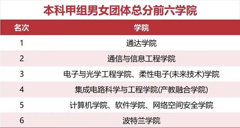 10月25日下午,运动会落幕。材料科学与工程学院荣获研究生男女团体总分第一名,海外教育学院荣获本科女子乙组团体、本科男子乙组团体、本科乙组男女团体总分第一名,通达学院荣获本科女子甲组团体、本科男子甲组团体总分第一名。数字媒体与设计艺术学院,电子与光学工程学院、柔性电子(未来技术)学院,自动化学院,贝尔英才学院,物联网学院,计算机学院、软件学院、网络空间安全学院获评“最美方阵”。