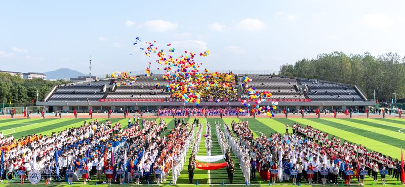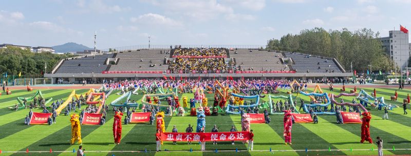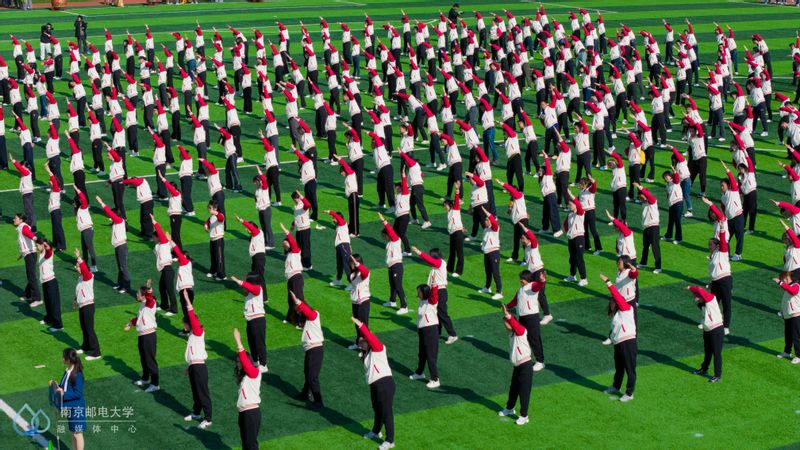 开幕式表演环节精彩不断。由校工会策划的教职工《第九套广播体操》表演,展现出教师们健康活力、积极向上的精神面貌。创意龙狮表演《纪念抗战胜利80周年——正义必胜》以气势恢宏的艺术语言,生动再现了中华民族在抗日战争中的英勇历程与不屈精神,演出在“正义必胜、和平必胜、人民必胜”的集体高呼中达到情感顶峰。由大二年级640名女生带来的大型团体操《解码青春》,通过不断变换队形与画板色彩,依次呈现出南邮红绿蓝特色元素,传递了“爱运动、邮未来”的精神内涵。