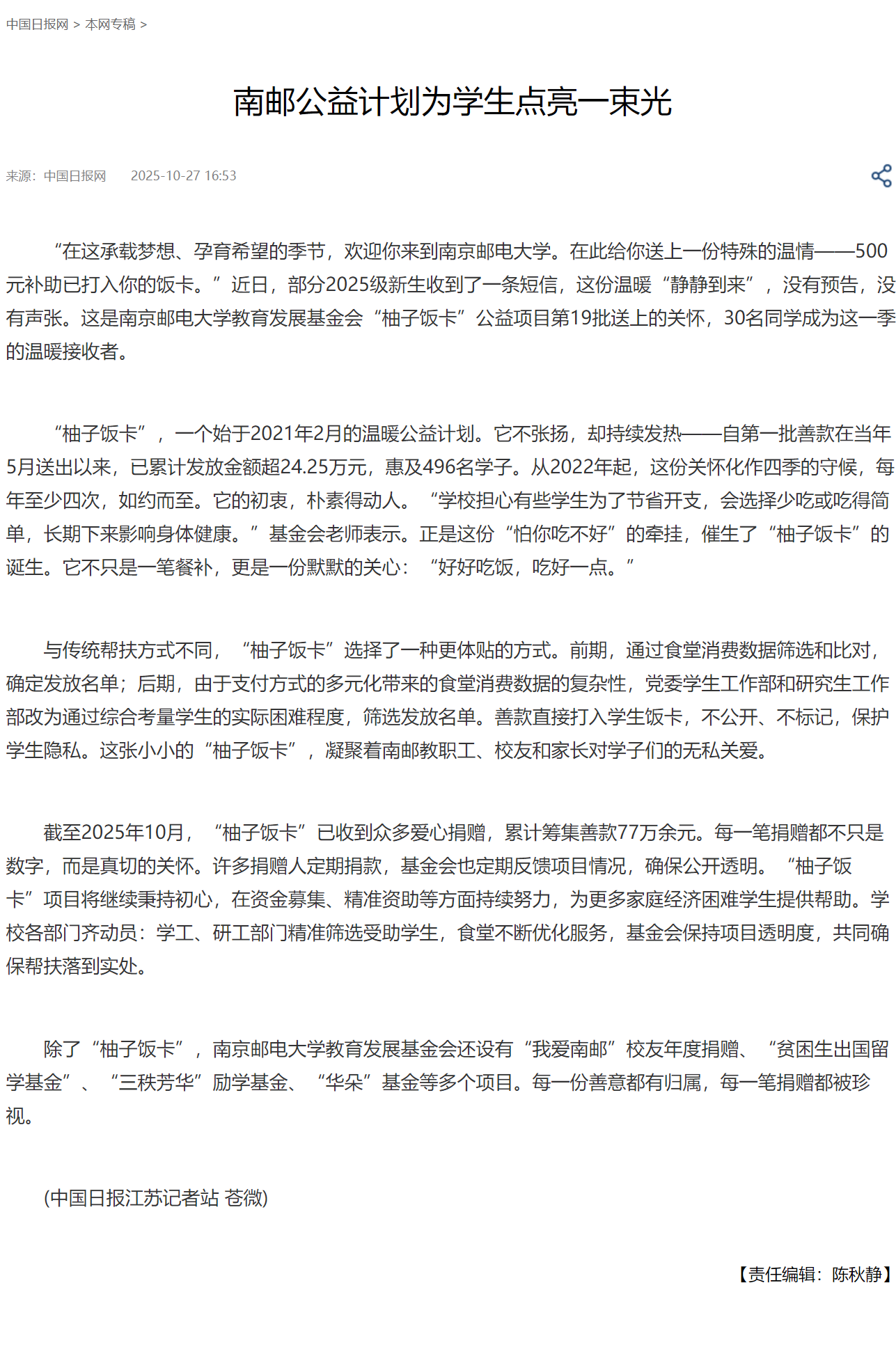 【中国日报网】南邮公益计划为学生点亮一束光