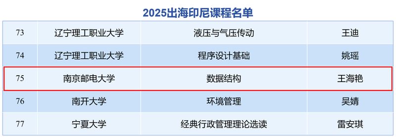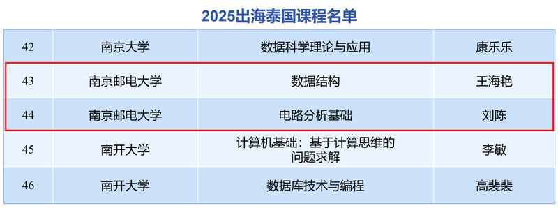 11月5日,世界慕课与在线教育联盟秘书处发布通知,2025年,中国49所高校的100门课程出海泰国,84所高校的237门高水平慕课出海至印尼。南京邮电大学2门优质课程入选,其中《数据结构》同步出海泰国、印尼两国慕课平台,《电路分析基础》出海泰国慕课平台。