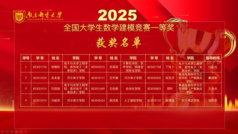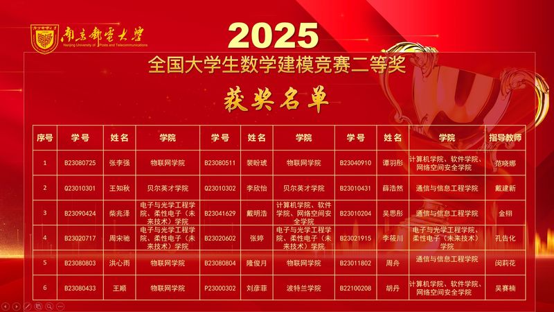 近日,2025年全国大学生数学建模竞赛获奖名单正式公布,南京邮电大学学生获全国一等奖4项、二等奖6项。一等奖数量位列全省高校第一、全国高校第四。
