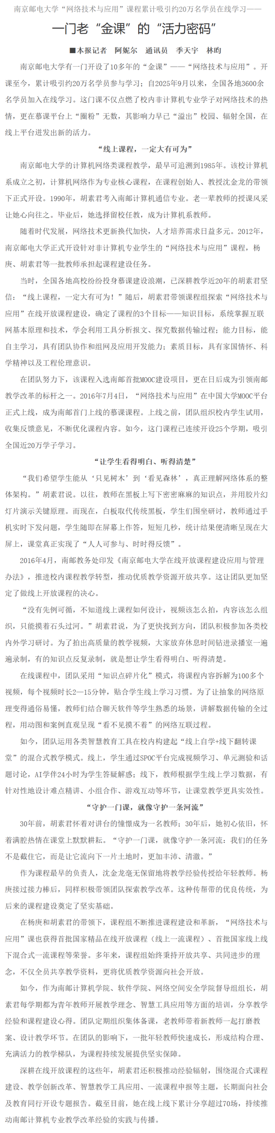 【江苏教育报】一门老“金课”的“活力密码”——南京邮电大学“网络技术与应用”课程累计吸引约20万名学员在线学习